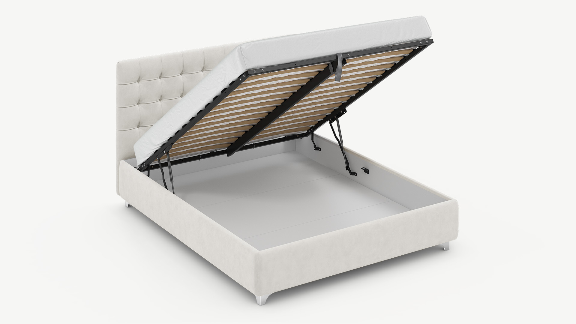 • Скрытая под основанием вместительная емкость без внутренних перегородок позволяет использовать всю площадь подкроватного пространства для хранения вещей.