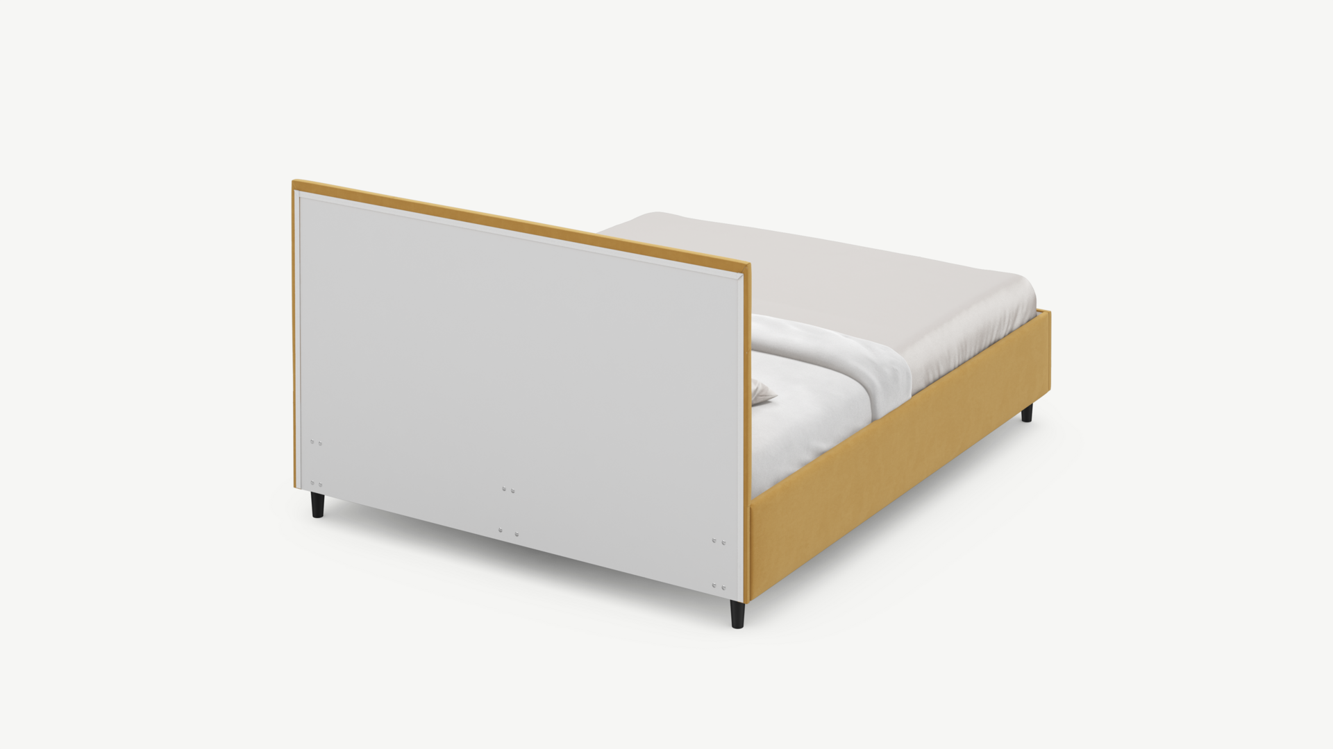 Элегантным и практичным акцентом служат скрытые карманы, расположенные по его углам. Лаконичные формы объемных царг создают единый гармоничный образ и фокусируют внимание на центральном текстурном элементе кровати.