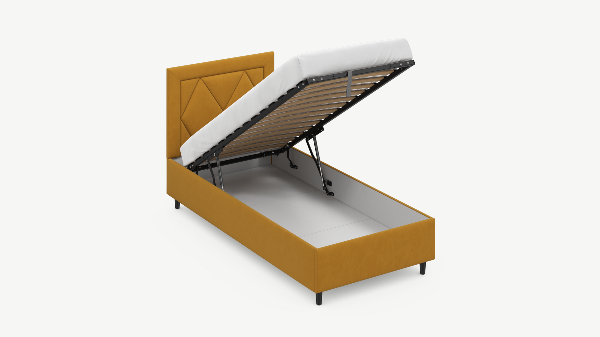 • Скрытая под основанием вместительная емкость без внутренних перегородок позволяет использовать всю площадь подкроватного пространства для хранения вещей.