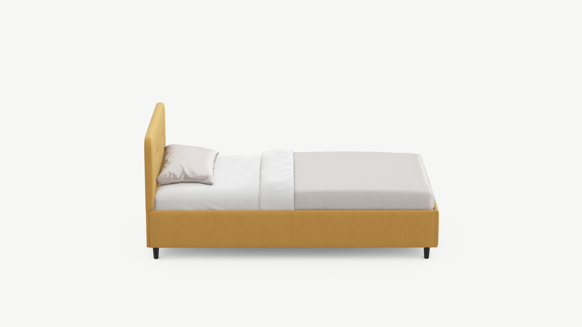 Царга, задающая пропорции, благодаря гладкости своей фактуры подчеркивает центральный элемент декора. Высокие опоры приподнимают фигуру кровати над полом и добавляют её образу визуальной легкости.