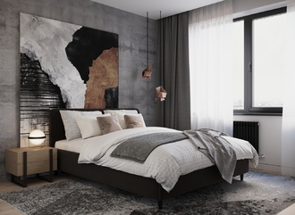 Царга, задающая пропорции, благодаря гладкости своей фактуры подчеркивает центральный элемент декора. Высокие опоры приподнимают фигуру кровати над полом и добавляют её образу визуальной легкости.