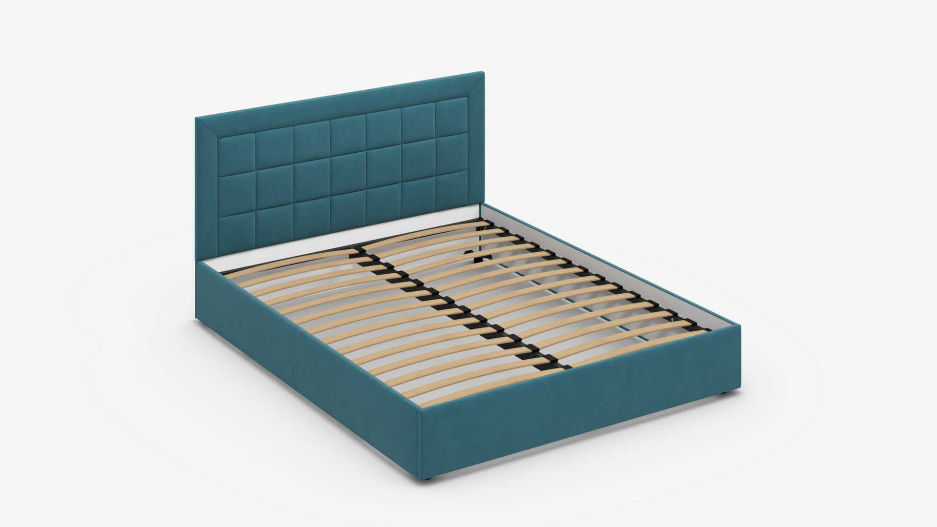 Изголовье декорировано рельефным рисунком стежки в крупный квадрат, получившим особую фактуру за счет глубины шва.