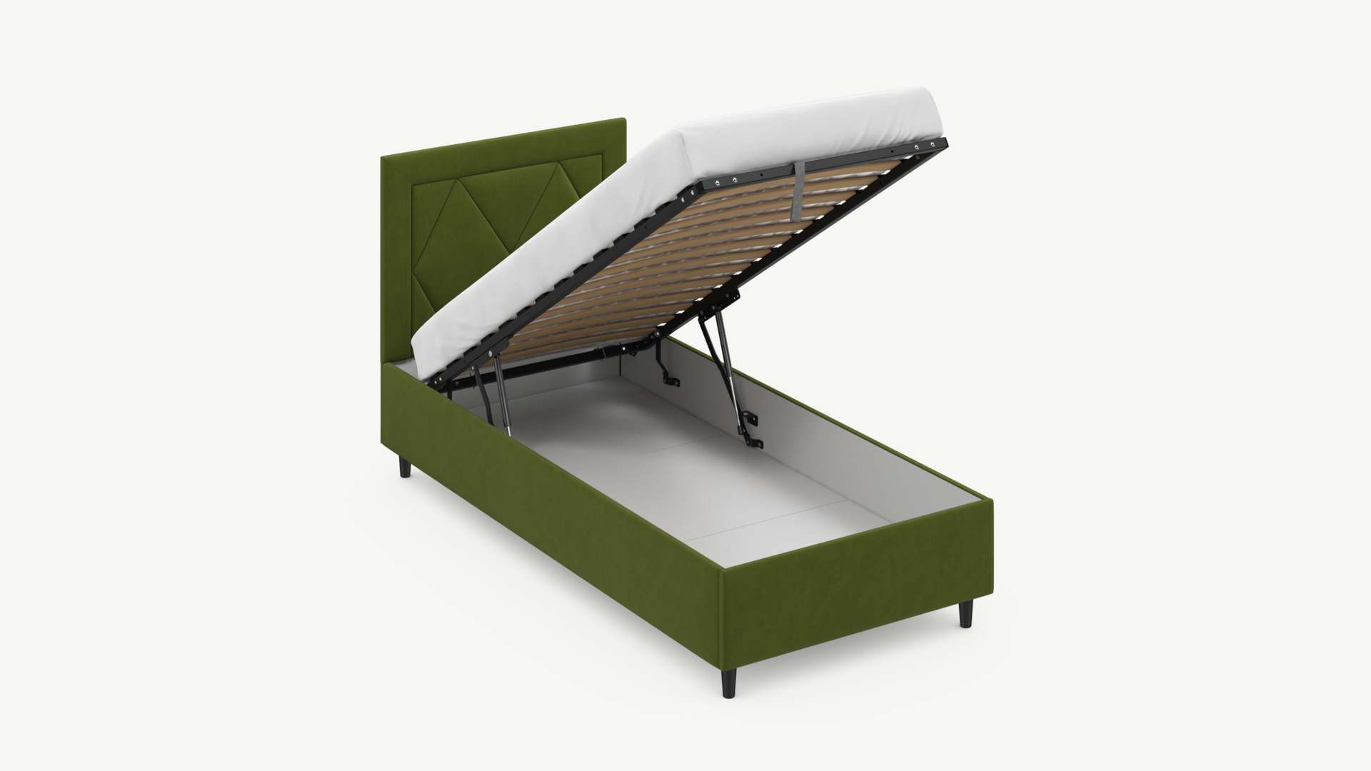 • Скрытая под основанием вместительная емкость без внутренних перегородок позволяет использовать всю площадь подкроватного пространства для хранения вещей.