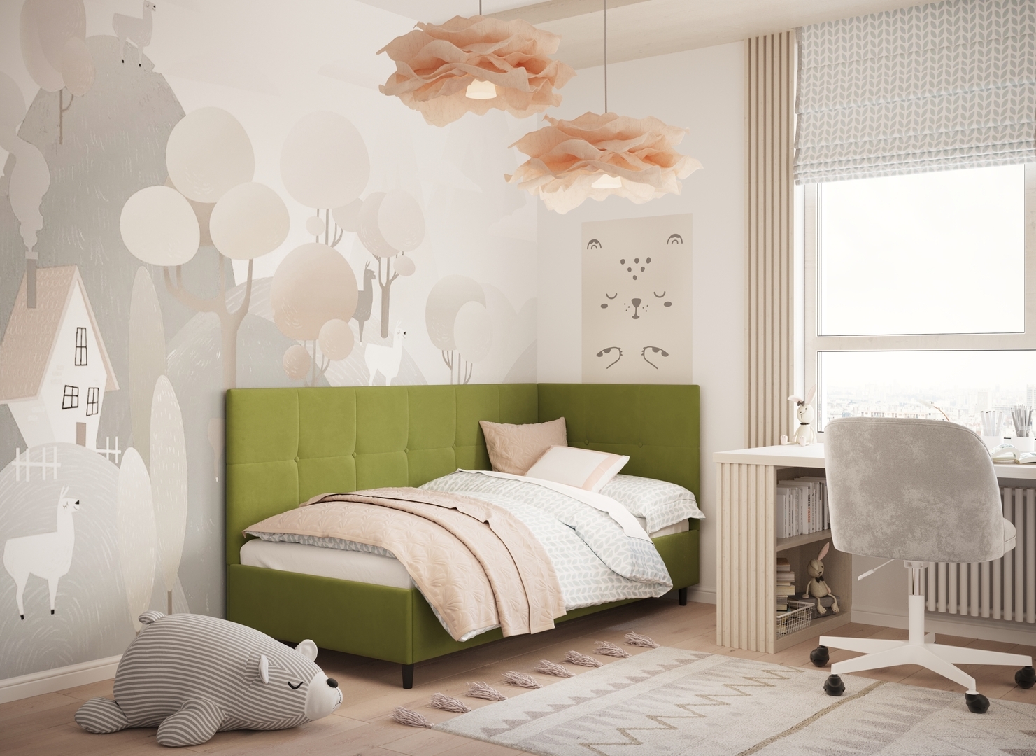 Угловая односпальная кровать MOON FAMILY 1261 с мягкой спинкой и изголовьем создаст в Вашей спальне ощущение уюта. Крупная квадратная стежка привносит в интерьер графических акцентов, а вставка из пуговиц наполняет пространство ощущением домашнего тепла.