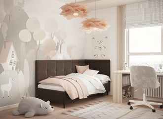 Угловая односпальная кровать MOON FAMILY 1261 с мягкой спинкой и изголовьем создаст в Вашей спальне ощущение уюта. Крупная квадратная стежка привносит в интерьер графических акцентов, а вставка из пуговиц наполняет пространство ощущением домашнего тепла.