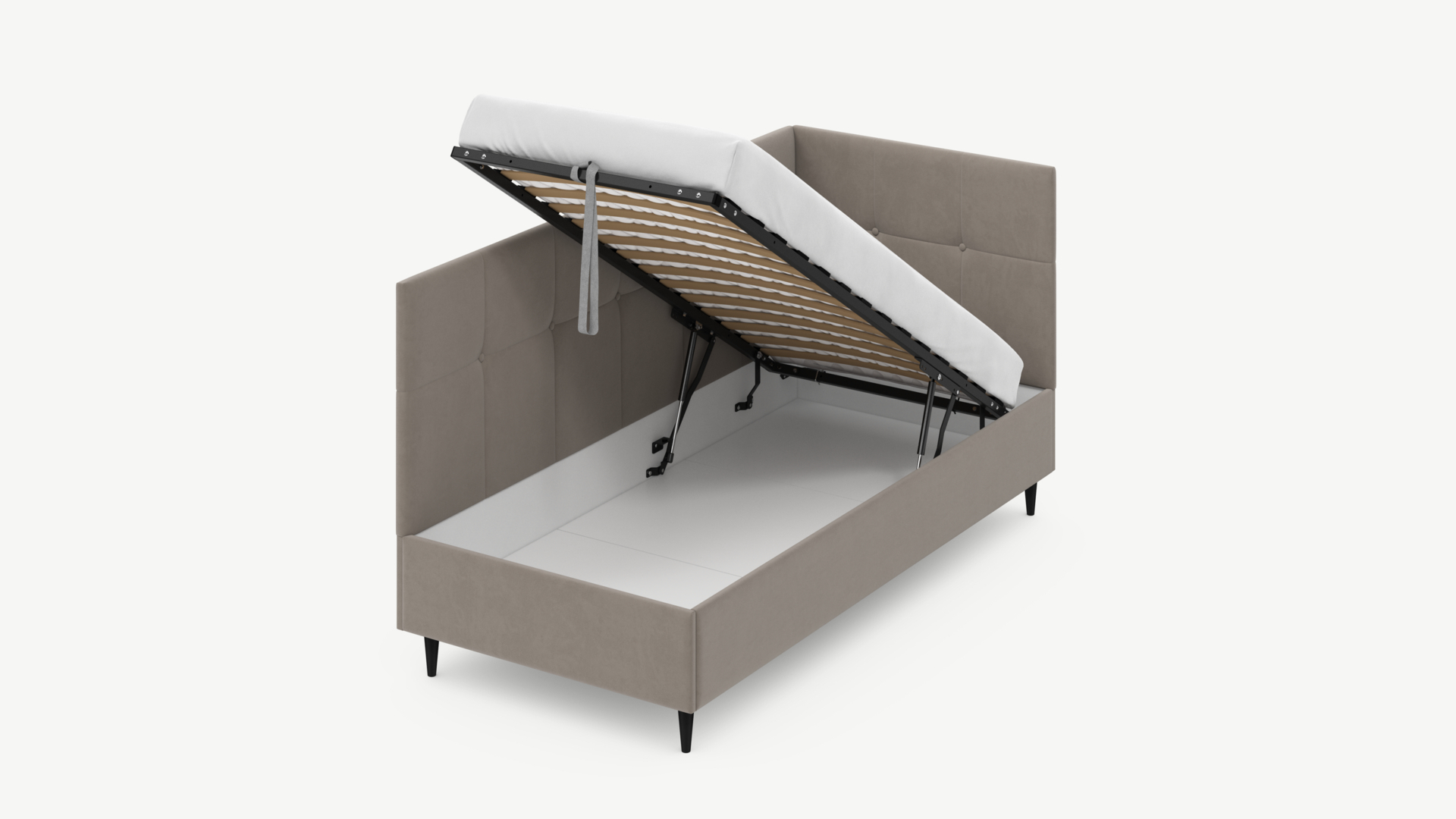 • Регулируемый подъемный механизм имеет два положения установки газовых амортизаторов в зависимости от веса матраса. Это дает возможность оптимально подстраивать угол подъема основания, а также плавно и бесшумно поднимать и опускать спальное место.