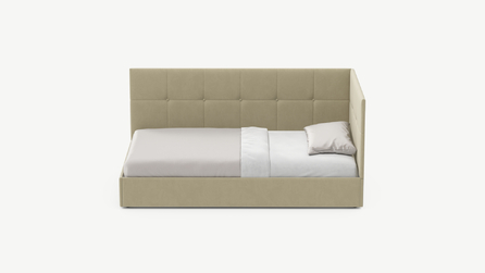 Угловая односпальная кровать MOON FAMILY 1261 с мягкой спинкой и изголовьем создаст в Вашей спальне ощущение уюта. Крупная квадратная стежка привносит в интерьер графических акцентов, а вставка из пуговиц наполняет пространство ощущением домашнего тепла.