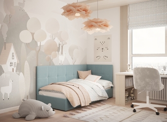Угловая односпальная кровать MOON FAMILY 1261 с мягкой спинкой и изголовьем создаст в Вашей спальне ощущение уюта. Крупная квадратная стежка привносит в интерьер графических акцентов, а вставка из пуговиц наполняет пространство ощущением домашнего тепла.