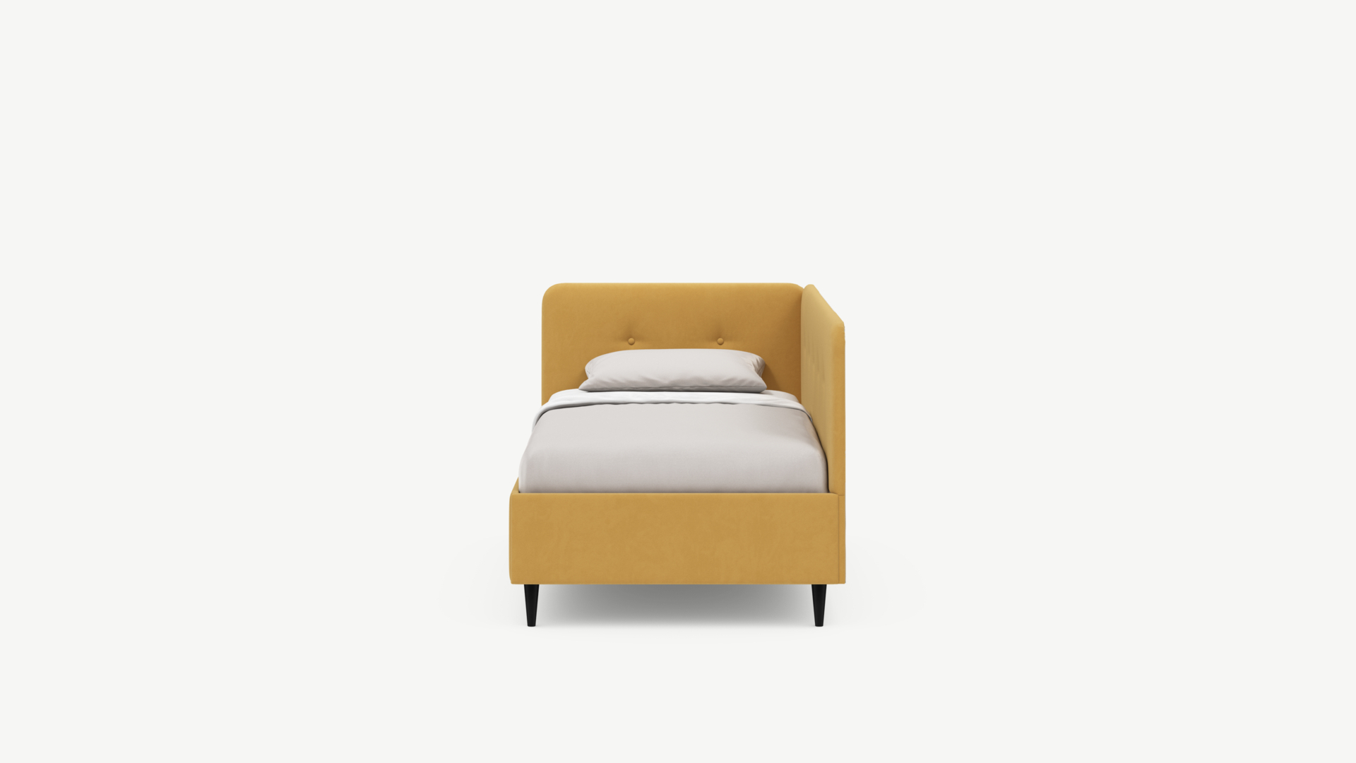 Угловая односпальная кровать MOON FAMILY 1253 с мягкой спинкой и изголовьем обладает округлыми формами, привносящими в интерьер нотки нежности. Изголовье, украшенное пуговицами, добавляет окружающему пространству шарм и уют. Высокие опоры придают кровати визуальной легкости, а также обеспечивают удобство во время уборки.