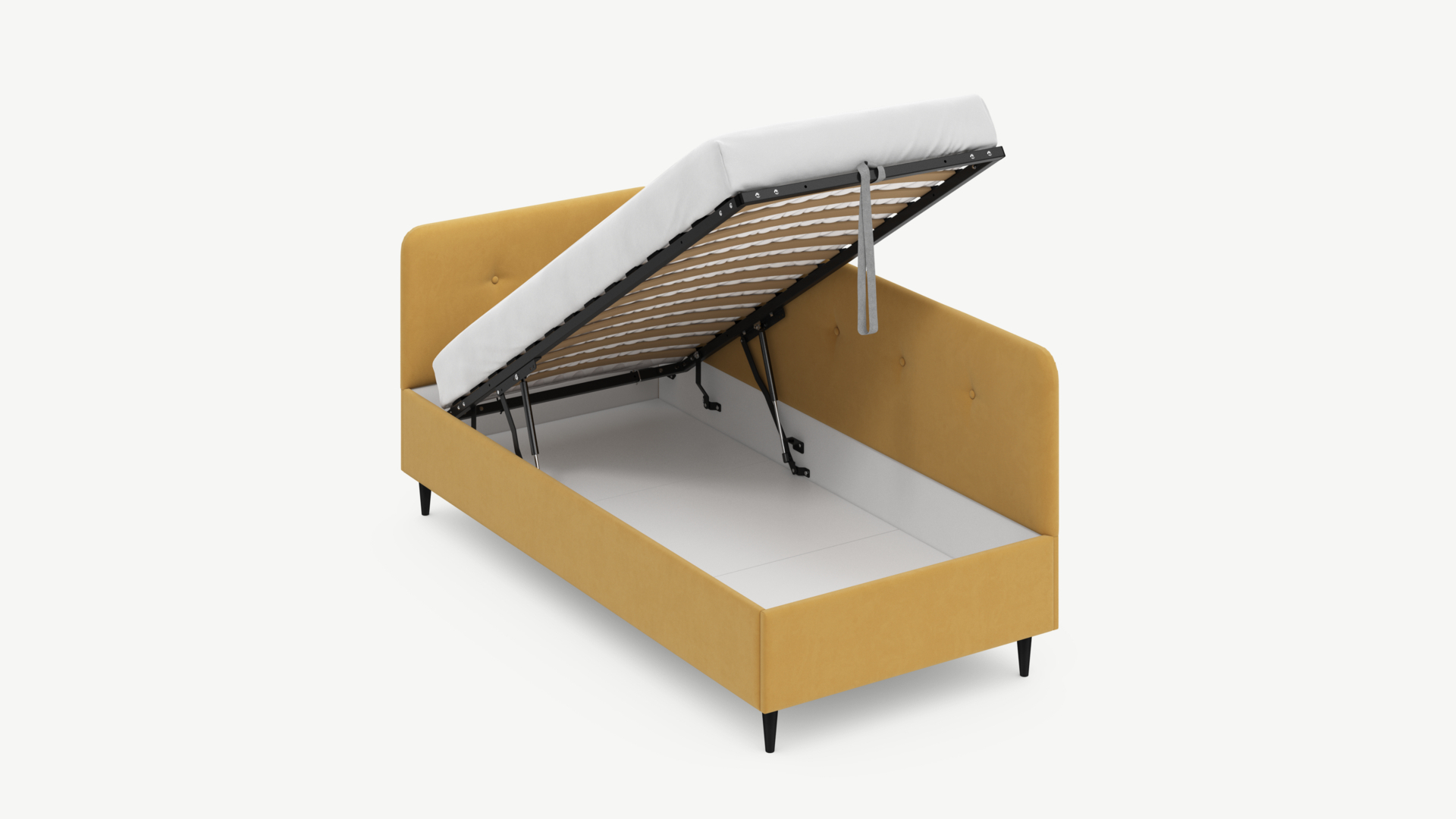 • Скрытая под основанием вместительная емкость без внутренних перегородок позволяет использовать всю площадь подкроватного пространства для хранения вещей.