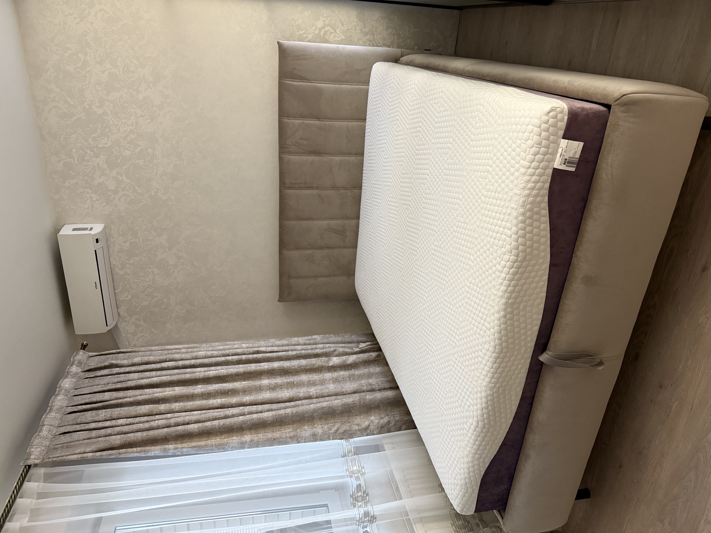 Обратная сторона изголовья выполнена в мебельной ткани и позволяет ставить кровать в центре комнаты для зонирования пространства.